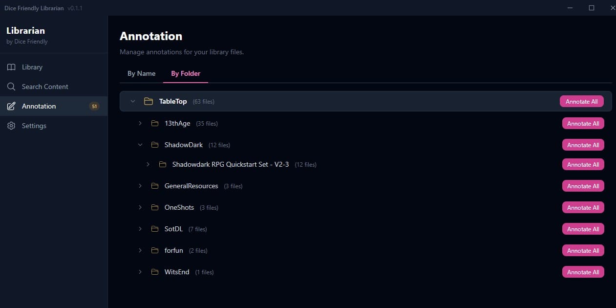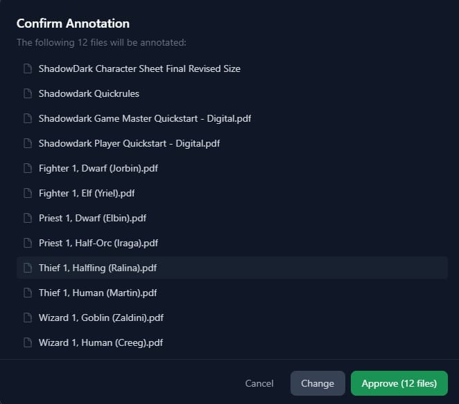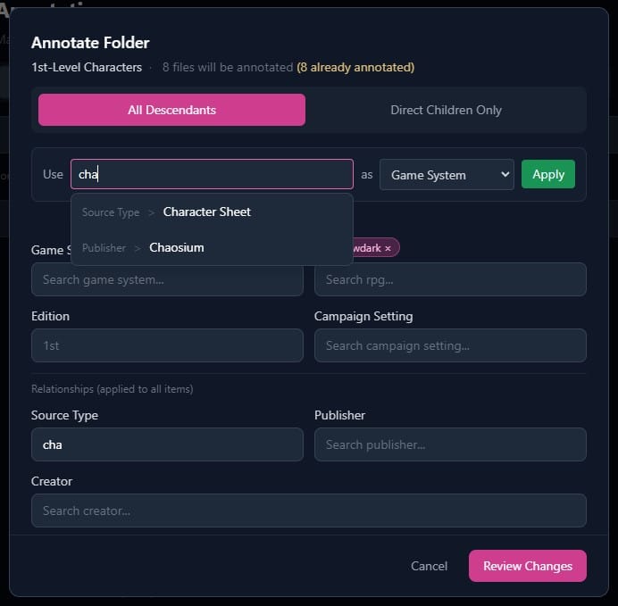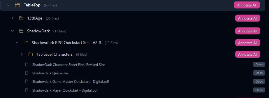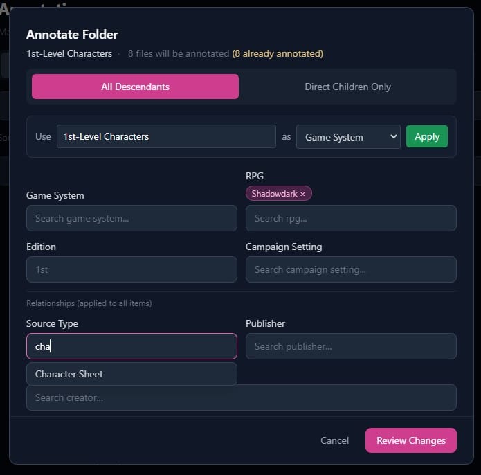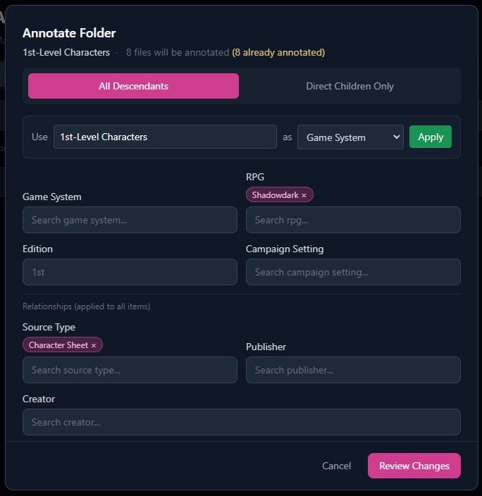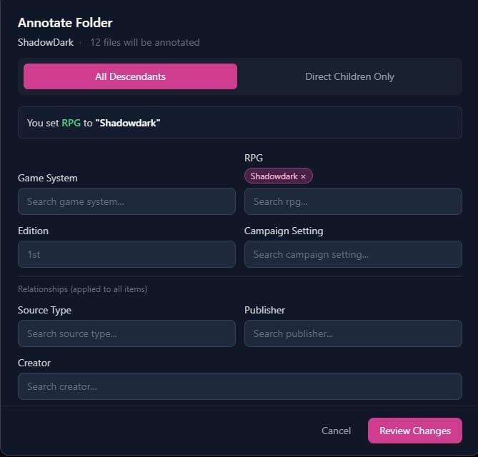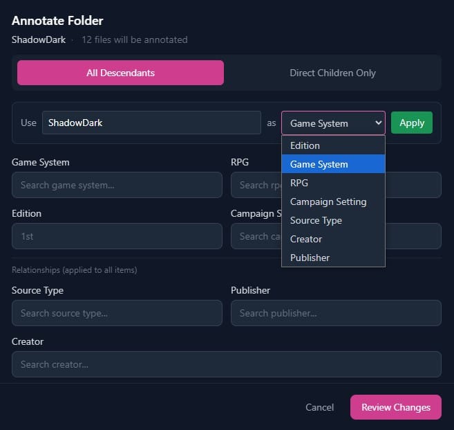 For example, I'm starting from scratch but I know everything in the Shadowdark folder is for Shadowdark. I go into folder view, and click "Annotate All" beside the folder, ShadowDark. The app asks if I want to use the folder name as something, and I have a chance to edit the text first. I change the casing to Shadowdark in the text field, select RPG from the dropdown and hit apply.
